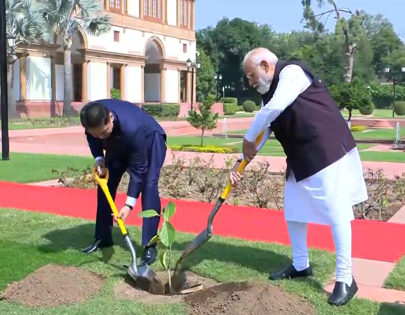 New Delhi [India], October 14 : Prime Minister Narendra Modi met the President of Mongolia, Khurelsukh Ukhnaa, here in the national capital on Tuesday. The two leaders exchanged pleasantries and also planted a sapling.
