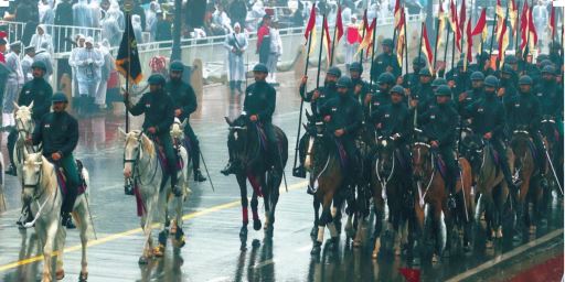 The ceremonial escort is organised into two divisions around the President's Buggy, with the Nishaan Toli carrying the two Standards of the regiment. The National Flag, the President's Standard, and the Regimental Standard were all carried by designated officers and risaldars.
