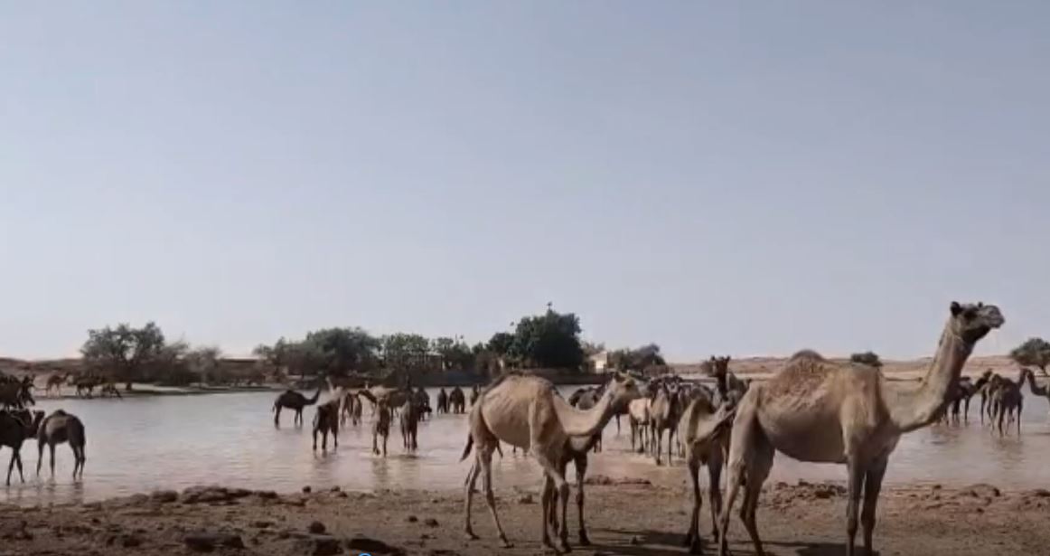 Tormented by the intense sun and gusts of hot wind, people are frequently spotted wandering about in search of cold water. Even the "ships of the desert", camels, are seeking respite from the severe heat by gathering at a local pond to cool off.