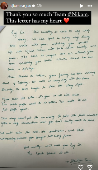 Taking to Instagram, RajKummar shared a heartfelt note from the film's direction team, updating his fans about the film's schedule.