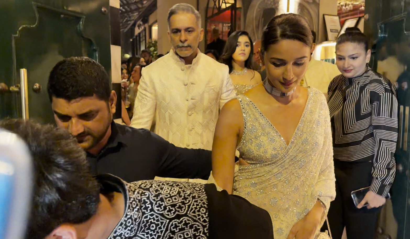 For the outing, Alia Bhatt opted for a white sequinned saree with fine embroidery. The actress paired the saree with a matching blouse and kept her look simple with a sleek bun, a statement choker, and soft makeup.