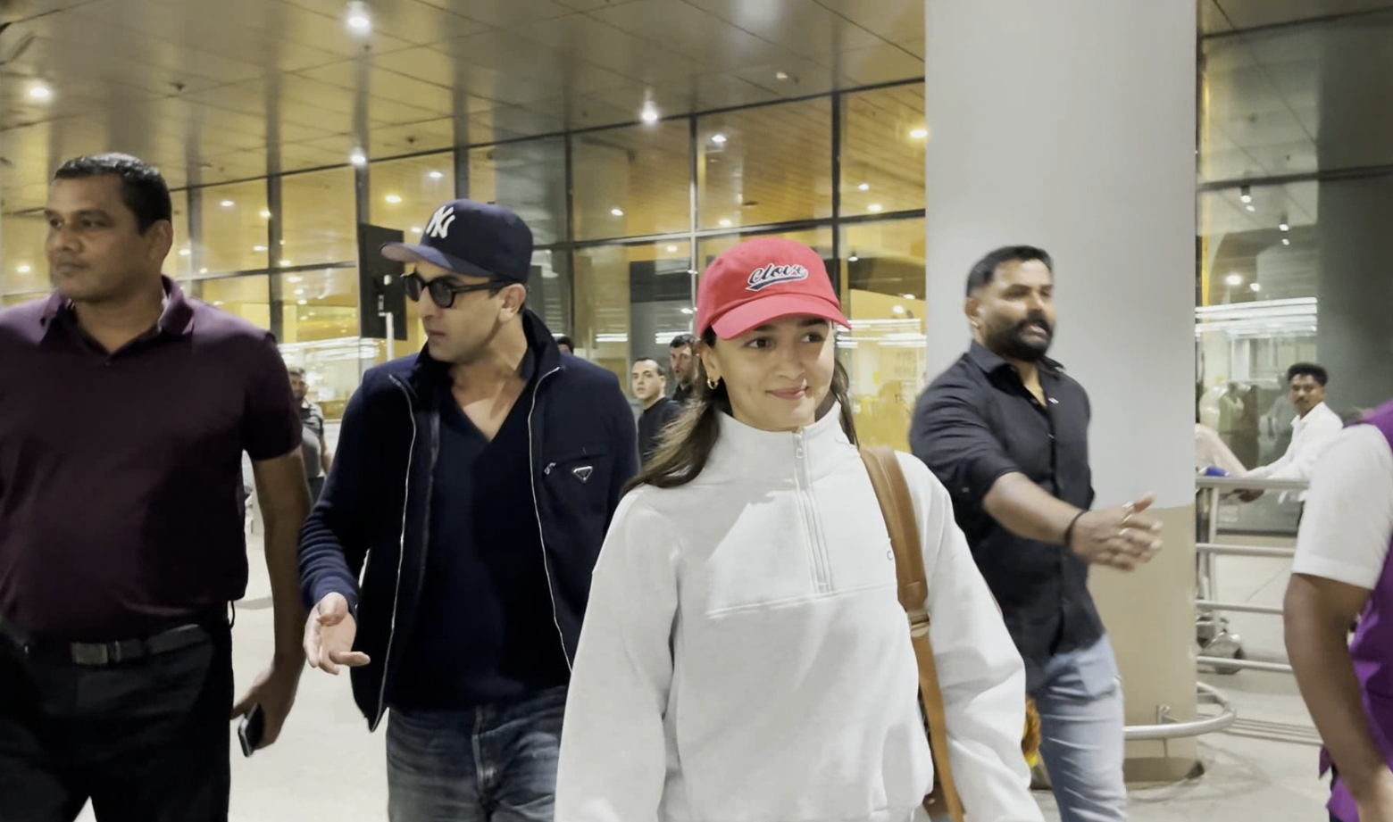For the airport look, the couple kept it simple and comfortable. Alia opted for an all-white co-ord set with a high-neck jacket and loose pants. She paired the outfit with a red cap, minimal makeup, and open hair. Ranbir, on the other hand, looked handsome in a blue full-sleeved T-shirt with a black half-jacket, denim jeans, and a cap, which he paired with cool sunglasses.