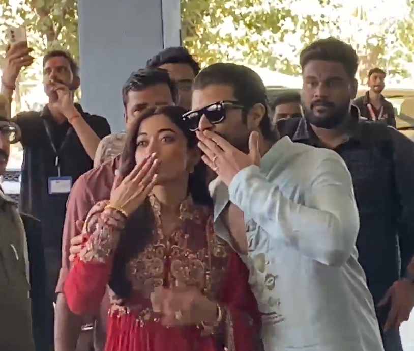 Rashmika was seen wearing a red dress, exuding pure bridal glow with her mehendi-adorned hands, sindoor, and traditional jewellery. Deverakonda donned a kurta pyjama that he teamed with sunglasses. The couple were seen sending flying kisses to fans.