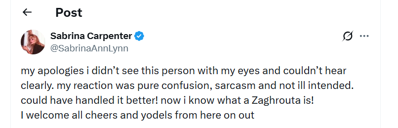 Responding to the backlash, Carpenter shared a message on X and offered a public apology. Admitting her reaction came from "pure confusion" and saying there was no bad intent behind it, she wrote, "my apologies i didn't see this person with my eyes and couldn't hear clearly. my reaction was pure confusion, sarcasm and not ill intended. could have handled it better! now i know what a Zaghrouta is!"