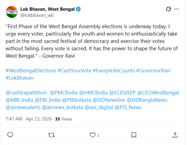 Official Account of Lok Bhavan, West Bengal, in a post on X stated, "First Phase of the West Bengal Assembly elections is underway today. I urge every voter, particularly the youth and women, to enthusiastically take part in the most sacred festival of democracy and exercise their votes without failing. Every vote is sacred. It has the power to shape the future of West Bengal. - Governor Ravi"