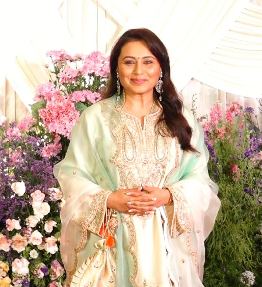 Rani Mukerji turned heads with her stunning looks as she graced the wedding celebrations in a traditional look. The 'Mardaani 3' star chose a light blue kurta set, which she paired with long earrings.