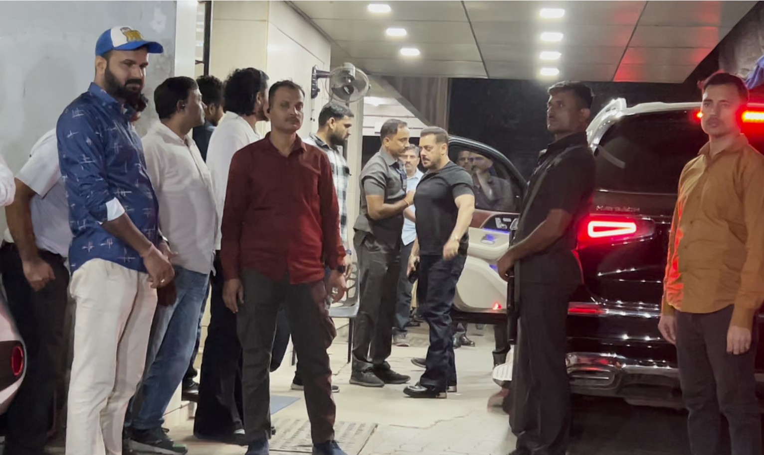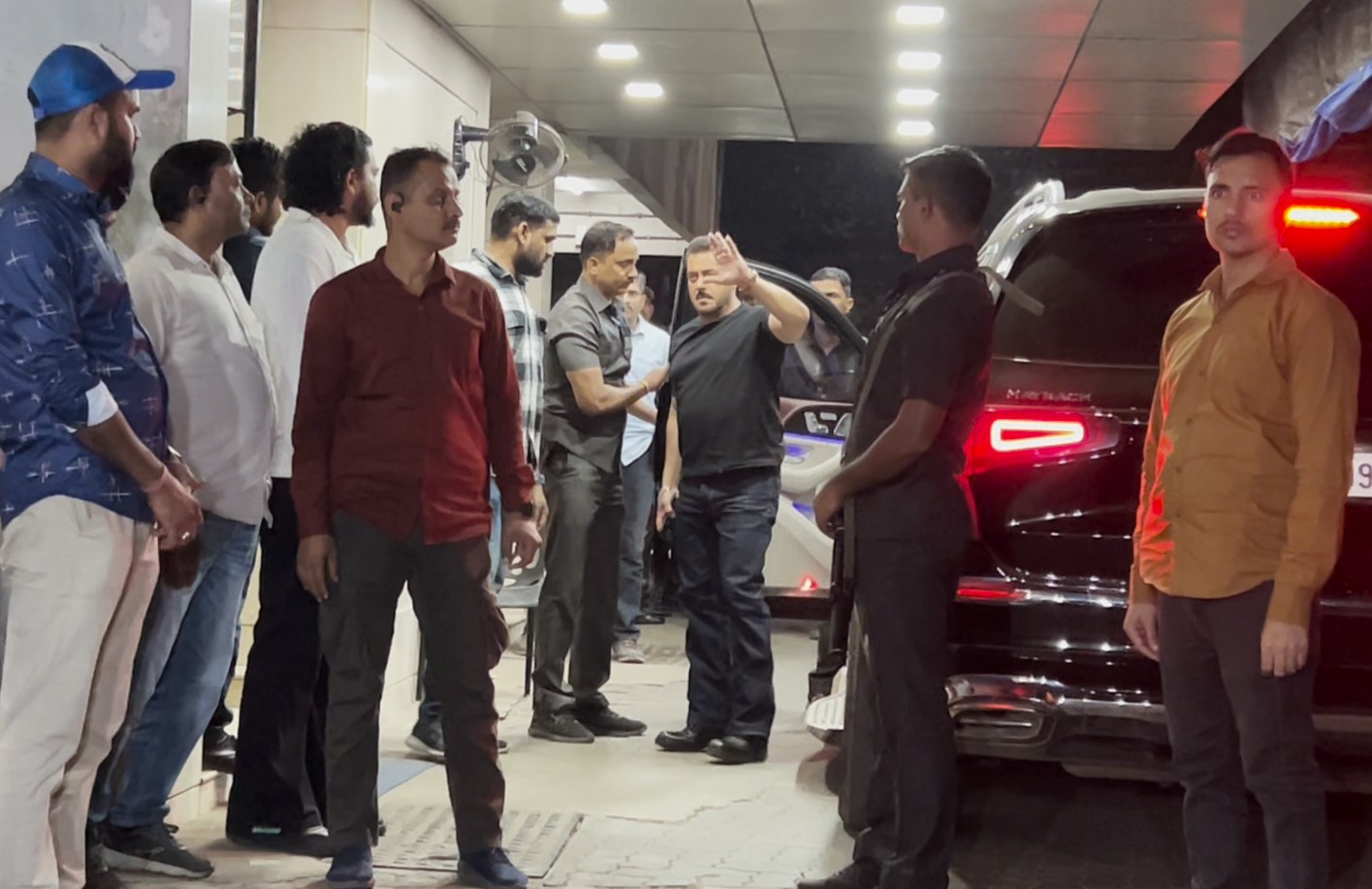The actor arrived at the private gathering on Monday with tight security around him. The 'Bajrangi Bhaijaan' actor was seen greeting paparazzi outside the venue.