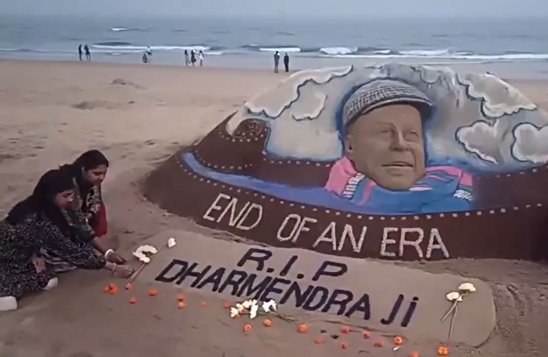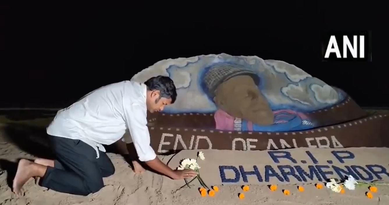 Sand artist Sudarsan Pattnaik creates five-foot sand art to pay tribute to Dharmendra