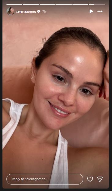 The Wizards of Waverly Place actress shared a new picture on her Instagram Story, looking calm and happy. The 33-year-old star wore a simple white tank top, her hair tied back in a neat bun, and no makeup on her face. She smiled softly while relaxing against a blush-pink background.