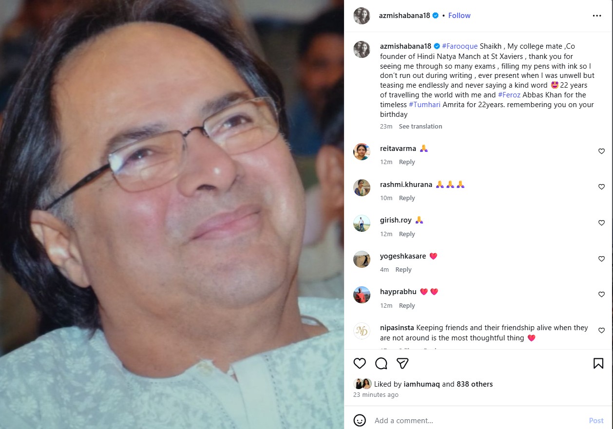 "Farooque Shaikh , My college mate ,Co founder of Hindi Natya Manch at St Xaviers , thank you for seeing me through so many exams , filling my pens with ink so I don't run out during writing , ever present when I was unwell but teasing me endlessly and never saying a kind word 22 years of travelling the world with me and #Feroz Abbas Khan for the timeless #Tumhari Amrita for 22years. remembering you on your birthday," Shabana posted.