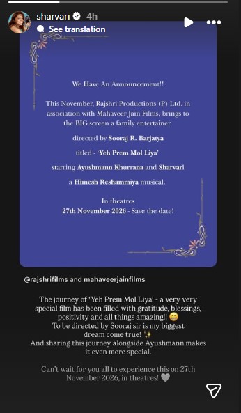 She added, "To be directed by Sooraj sir is my biggest dream come true! And sharing this journey alongside Ayushmann makes it even more special. Can't wait for you all to experience this on 27th November 2026, in theatres!"