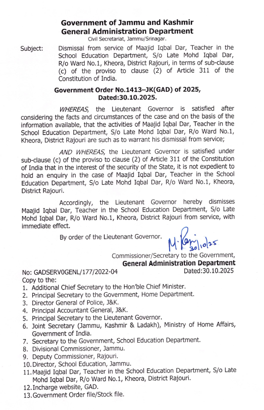 Government of Jammu and Kashmir General Administration Department (CAD) in an order on Thursday said," The Lieutenant Governor is satisfied under sub-clause (c) of the proviso to clause (2) of Article 311 of the Constitution of India that in the interest of the security of the State, it is not expedient to hold an enquiry in the case of Maajid Iqbal Dar, Teacher in the School Education Department, S/o Late Mohd Iqbal Dar, R/o Ward No.1, Kheora, District Rajouri".