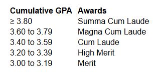 SMU uses the cumulative Grade Point Average (GPA) criteria to identify degree candidates with academic excellence in the following award categories: Summa Cum Laude, Magna Cum Laude and Cum Laude. These are Latin awards adopted from the American system, and can be translated as with Highest Distinction, with High Distinction and with Distinction, respectively.