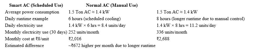 Electricity consumption depends on how long the air conditioner runs and the temperature settings selected by the user. Smart ACs have digital monitoring tools that help track runtime and cooling patterns. Normal AC units operate without built-in energy monitoring features. Electricity usage becomes visible mainly through monthly electricity bills.