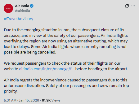 The advisory read, "Due to the emerging situation in Iran, the subsequent closure of its airspace, and in view of the safety of our passengers, Air India flights overflying the region are now using an alternative routing, which may lead to delays. Some Air India flights where currently rerouting is not possible are being cancelled."