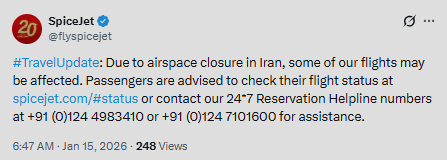 "Due to airspace closure in Iran, some of our flights may be affected. Passengers are advised to check their flight status at https://t.co/2wynECZugy or contact our 24*7 Reservation Helpline numbers at +91 (0)124 4983410 or +91 (0)124 7101600 for assistance," the advisory stated.