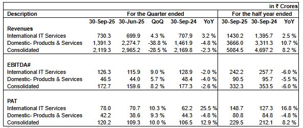 "International IT Services reported steady progress during the quarter, consolidated PAT improving by 10% quarter-on-quarter. The business secured a large deal in the healthcare vertical with a leading provider, reaffirming our focus on driving growth through large deals and consistent execution. Our continued strategic investments in Artificial Intelligence are delivering results, with AI-led orders accounting for approximately 10% of the overall order book for the quarter. As clients accelerate AI-enabled modernization to enhance competitiveness, we remain confident in the company's long-term growth trajectory."