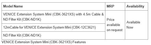 The VENICE Extension System Mini (CBK-3621XS) comes with 4.5m Cable and ND Filter Kit (CBK-ND1K). The VENICE Extension System Mini (CBK-3621XS), 12m Cable for VENICE Extension System Mini (CBK-12C3621) and ND Filter Kit (CBK-ND1K) is now available.