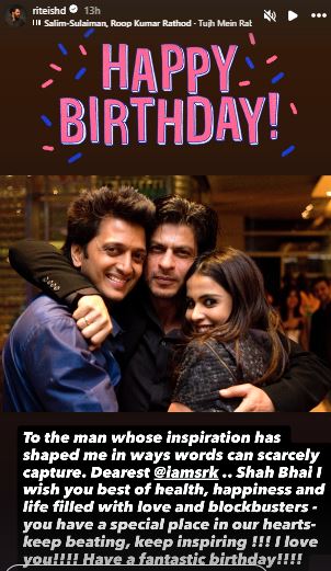 Actor Riteish Deshmukh shared an old picture, showing him with SRK and Genelia and wrote, "To the man whose inspiration has shaped me in ways words can scarcely capture. Dearest @iamsrk..Shah Bhai I wish you best of health, happiness and life filled with love and blockbusters - you have a special place in your hearts - keep beating, keep inspiring!!! I love you!!!! Have a fantastic birthday!!!!"
