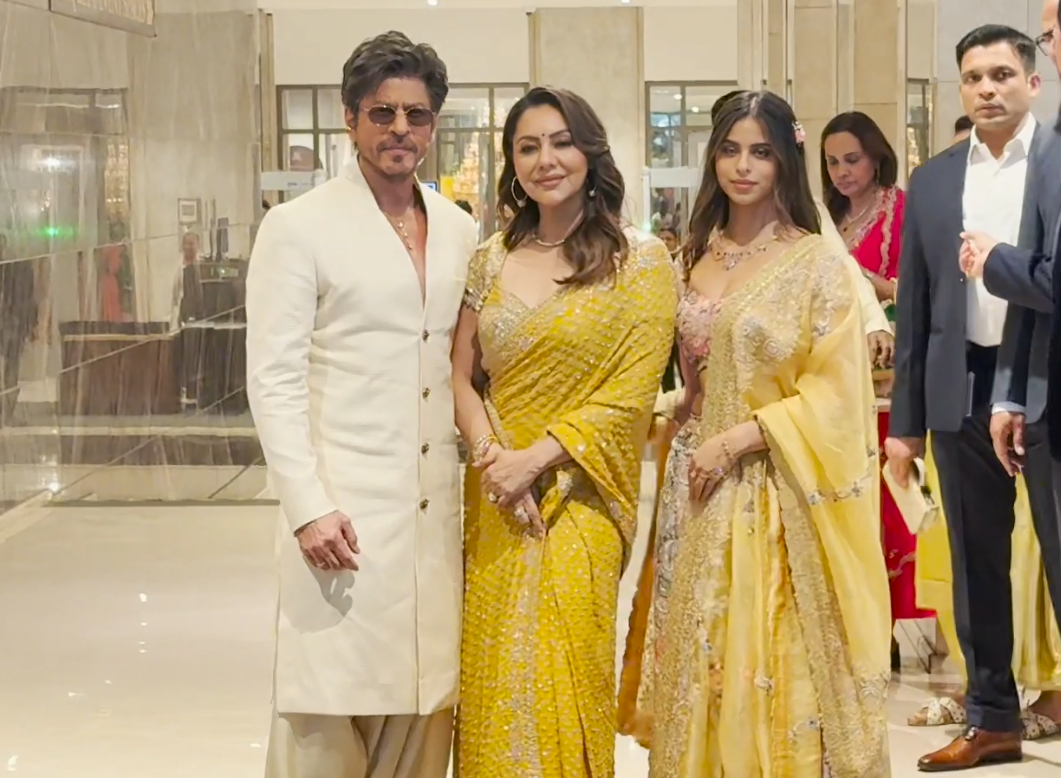SRK looked dashing as always, opting for an off-white traditional outfit. Gauri, on the other hand, looked gorgeous in a shimmery yellow saree, while their daughter, actor Suhana Khan, looked stunning in a yellow lehenga.