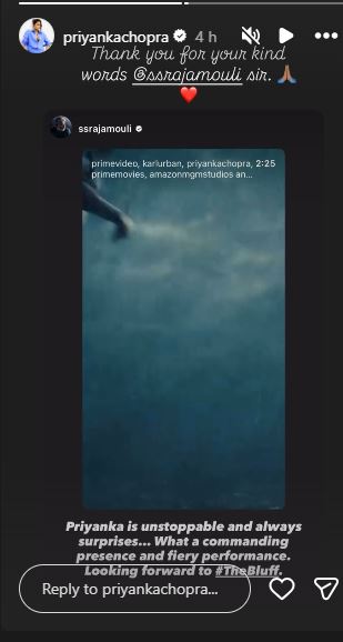 Taking to Instagram Story, Rajamouli wrote, "Priyanka is unstoppable and always surprises....what a commanding presence and fiery performance. Looking forward to 'The Bluff'."