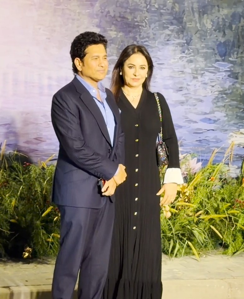 Tendulkar was accompanied by his wife, Anjali Tendulkar, as the couple joined other guests in celebrating the newlyweds.