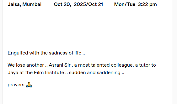 "We lose another .. Asrani Sir , a most talented colleague, a tutor to Jaya at the Film Institute .. sudden and saddening ..," Amitabh posted.