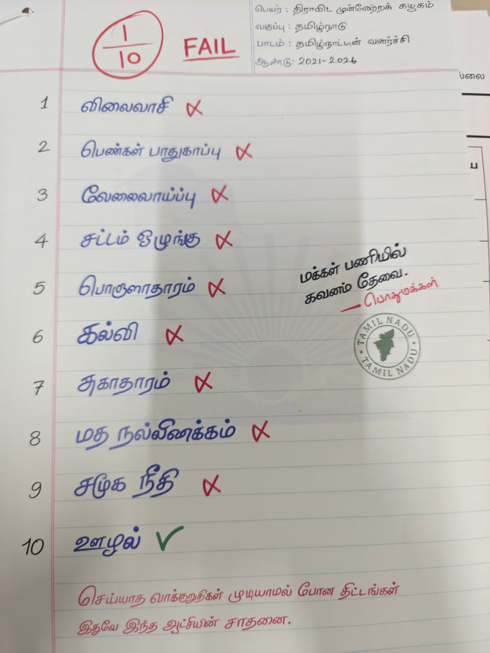 Highlighting the promises made by the DMK government, the BJP released the statistical "report card" resembling an exam score sheet. The report was released and criticised within the Assembly premises by BJP MLA Nainar Nagendran.