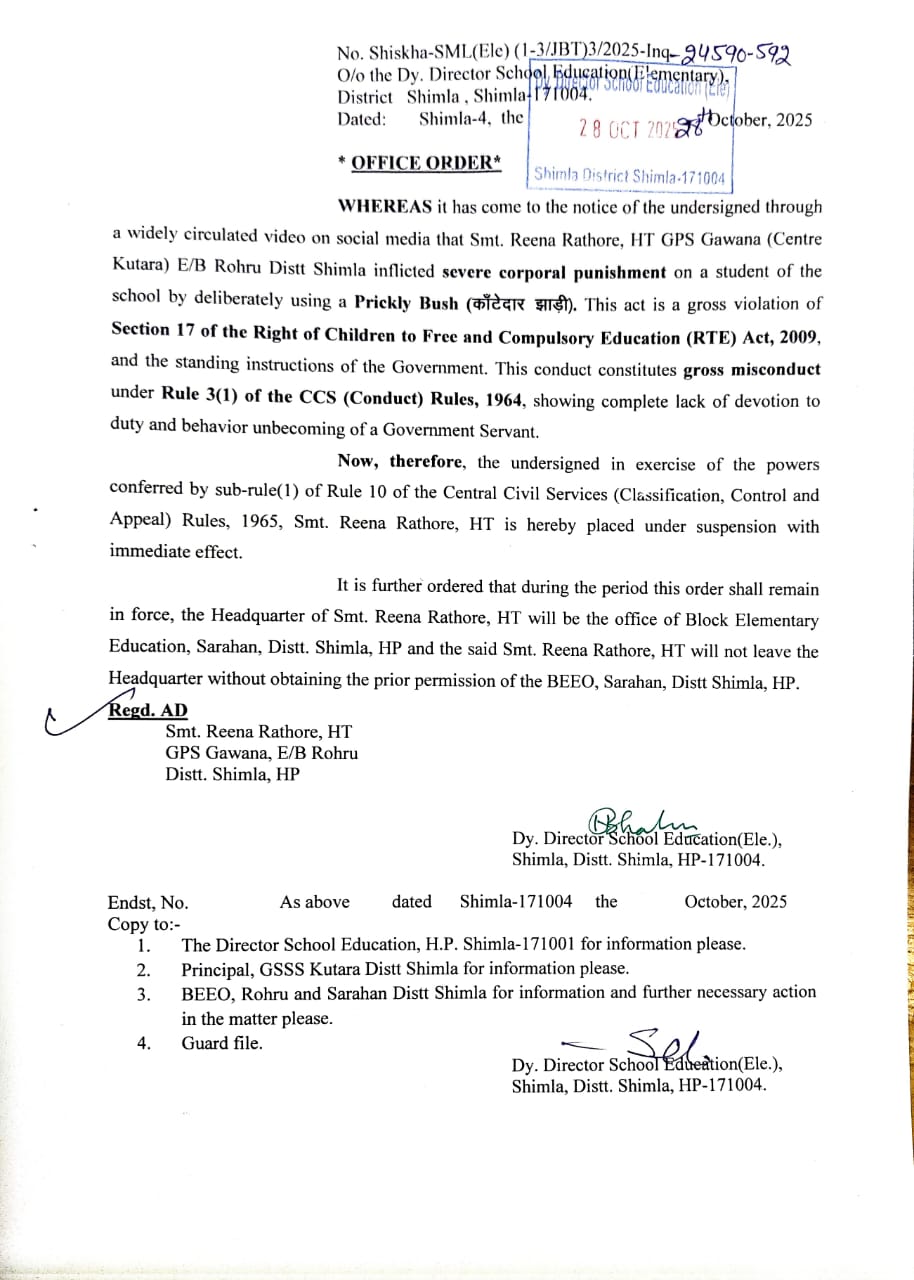 "It has come to the notice of the undersigned through a widely circulated video on social media that Reena Rathore, HT GPS Gawana (Centre Kutara) E/B Rohru Distt Shimla, inflicted severe corporal punishment on a student of the school by deliberately using a prickly bush. This act is a gross violation of Section 17 of the Right of Children to Free and Compulsory Education (RTE) Act, 2009, and the standing instructions of the Government. This conduct constitutes gross misconduct under Rule 3(1) of the CCS (Conduct) Rules, 1964, showing complete lack of devotion to duty and behaviour unbecoming of a Government Servant," the order states.