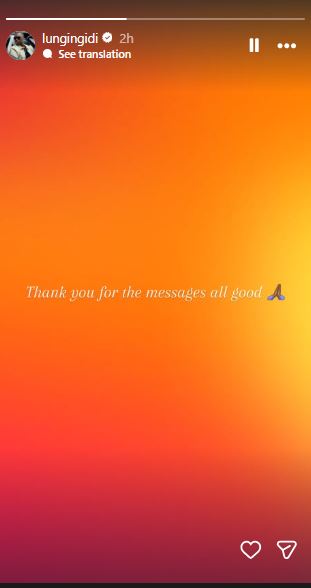"Thank you for the messages, all good," Ngidi wrote in his first public reaction after the injury scare, easing fears over his condition, while sharing a story on Instagram.