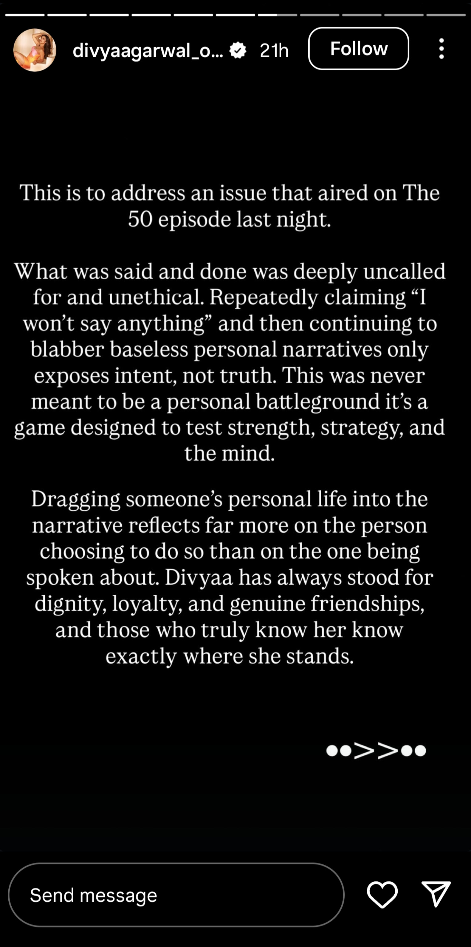 In the statement, Divya's team wrote: "This is to address an issue that aired on The 50 episode last night. What was said and done was deeply uncalled for and unethical. Repeatedly claiming 'I won't say anything' and then continuing to blabber baseless personal narratives only exposes intent, not truth. This was never meant to be a personal battleground; it's a game designed to test strength, strategy, and the mind."