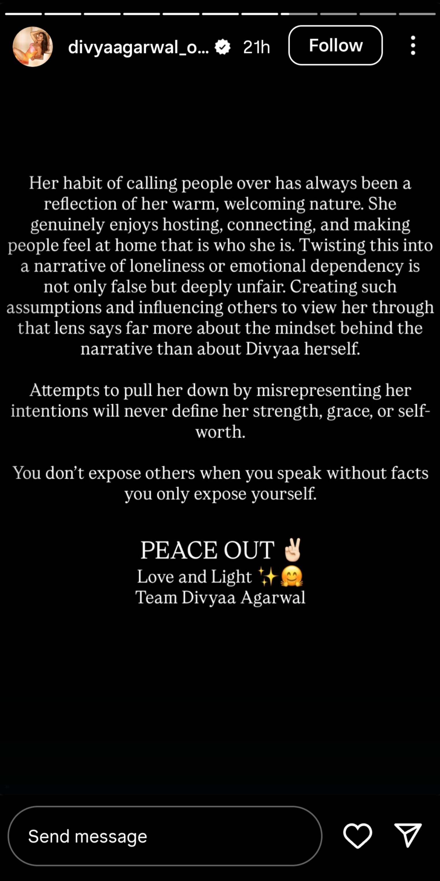 "Dragging someone's personal life into the narrative reflects far more on the person choosing to do so than on the one being spoken about. Divya has always stood for dignity, loyalty, and genuine friendships, and those who truly know her know exactly where she stands," the statement read.