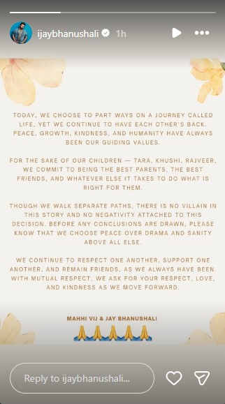 "Before any conclusions are drawn, please know that we choose peace over drama and sincerity above all else. We continue to respect one another, support one another, and remain friends, as we always have. With mutual respect, we ask for your respect, love, and kindness as we move forward. Mahhi Vij and Jay Bhanushali," the statement further read.