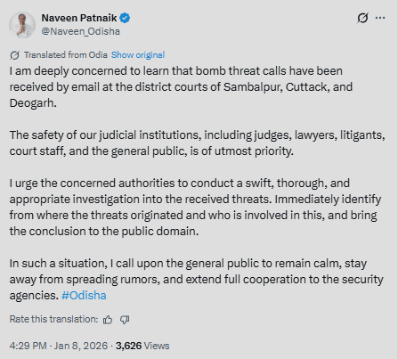 "I am deeply concerned to learn that bomb threat calls have been received by email at the district courts of Sambalpur, Cuttack, and Deogarh. The safety of our judicial institutions, including judges, lawyers, litigants, court staff, and the general public, is of utmost priority," he emphasised.