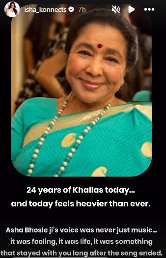 Taking to her Instagram story, Isha shared a heartfelt message that read, "24 years of Khallas today... and today feels heavier than ever. Asha Bhosle ji's voice was never just music...it was feeling, it was life, it was something that stayed with you long after."