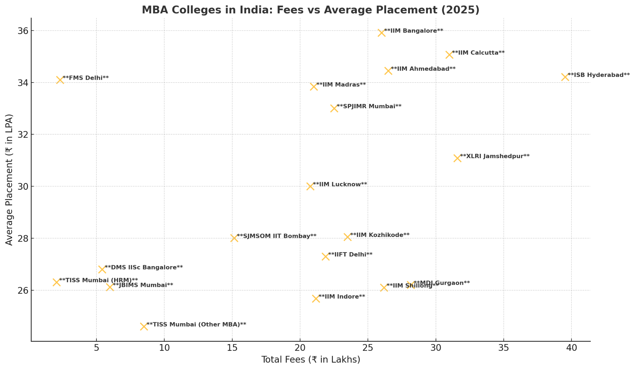 * ISB Hyderabad charges the highest fee of around ₹39.5, matching IIMs in placement records of around ₹34 LPA.