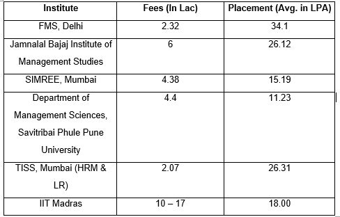 * FMS Delhi has the best ROI as the minimal fees are around ₹2.32L, but placement packages are around ₹34 LPA.