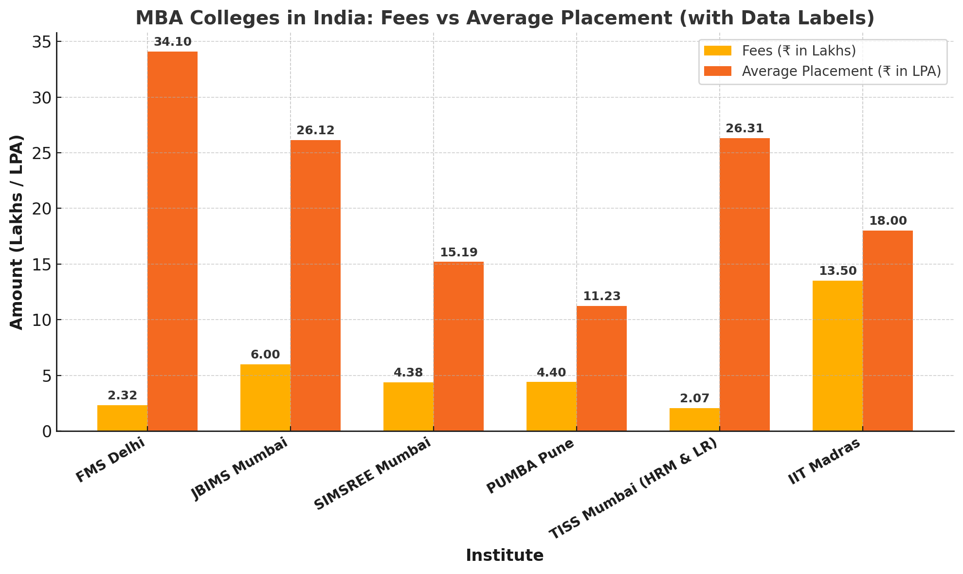 Among the most affordable MBA programs in India, FMS Delhi, JBIMS Mumbai, and TISS Mumbai are the ones that still provide a good ROI, although they are much cheaper than the premium private institutions. Additionally, admission to government-funded colleges, such as SIMSREE Mumbai, DFS Delhi, and different IITs, along with a few state universities, ensures quality education and good placement at low fees.