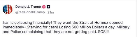 In a post on Truth Social, Trump claimed that Tehran is "starving for cash" and is allegedly "losing 500 Million Dollars a day." He further stated that the Iranian leadership is under significant internal pressure, with the "Military and Police complaining that they are not getting paid."