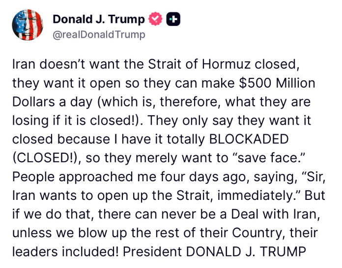 Trump further claimed that Iran's outward hostility regarding the waterway is a performance intended for a political audience rather than a reflection of its financial reality. "Iran doesn't want the Strait of Hormuz closed; they want it open so they can make USD 500 million a day (which is, therefore, what they are losing if it is closed!)" he posted, suggesting the blockade is crippling the Iranian economy.