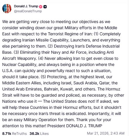 "We are getting very close to meeting our objectives as we consider winding down our great Military efforts in the Middle East with respect to the Terrorist Regime of Iran: (1) Completely degrading Iranian Missile Capability, Launchers, and everything else pertaining to them. (2) Destroying Iran's Defense Industrial Base. (3) Eliminating their Navy and Air Force, including Anti Aircraft Weaponry. (4) Never allowing Iran to get even close to Nuclear Capability, and always being in a position where the U.S.A. can quickly and powerfully react to such a situation, should it take place. (5) Protecting, at the highest level, our Middle Eastern Allies, including Israel, Saudi Arabia, Qatar, the United Arab Emirates, Bahrain, Kuwait, and others," Trump said.