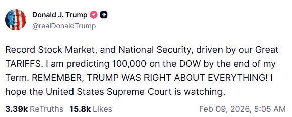 In a post on Truth Social, the US President said, "Record Stock Market, and National Security, driven by our Great TARIFFS. I am predicting 100,000 on the DOW by the end of my Term. REMEMBER, TRUMP WAS RIGHT ABOUT EVERYTHING! I hope the United States Supreme Court is watching."