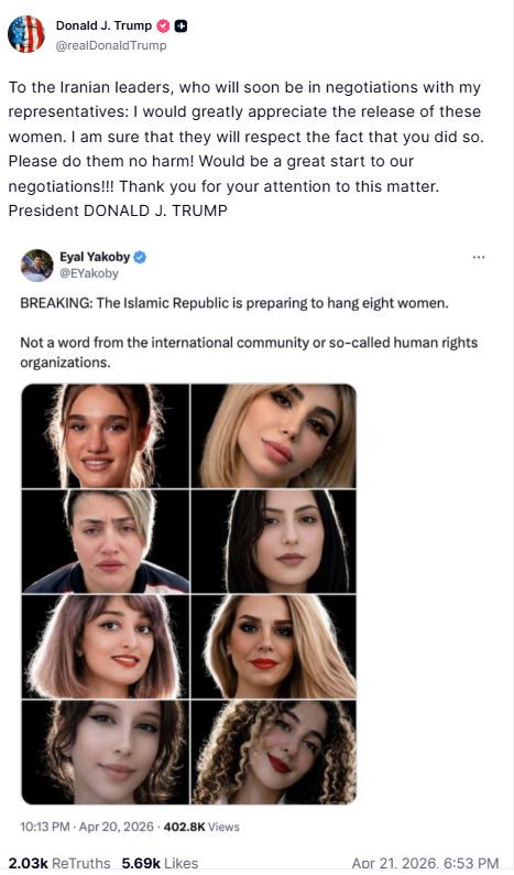 In a post on Truth Social on Tuesday, President Trump shared a screenshot from social media activist Eyal Yakoby alleging that eight women in Iran were at imminent risk of being hanged.