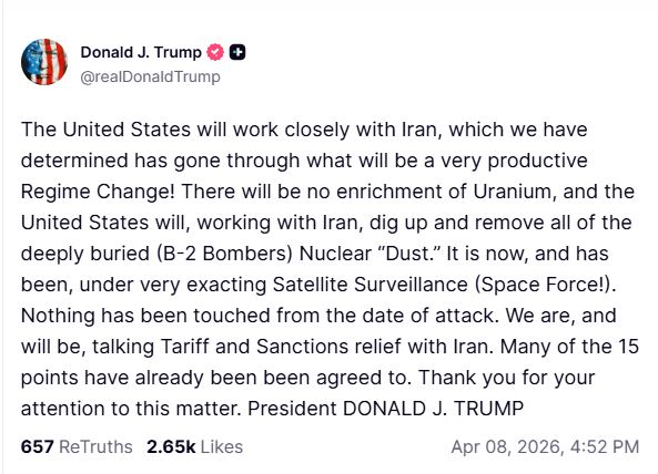 Washington, DC [US], April 8 : United States President Donald Trump on Wednesday announced that Washington intends to demand a total cessation of uranium enrichment in Iran, while simultaneously initiating discussions regarding sanctions relief and tariff reductions. The President characterised the recently brokered ceasefire as the start of a "very productive regime change" for the Islamic Republic.