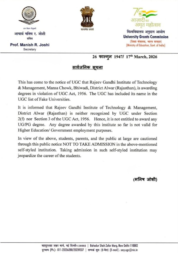 On X, UGC India wrote, "UGC has declared Rajeev Gandhi Institute of Technology & Management, Alwar (Rajasthan) as a fake institution. The institute is not recognised and is not authorised to award any UG/PG degrees. Any degree issued by it is not valid for higher education or government employment. Students, parents, and the public are advised not to take admission in such self-styled institutions. Stay informed. Choose recognised institutions only."