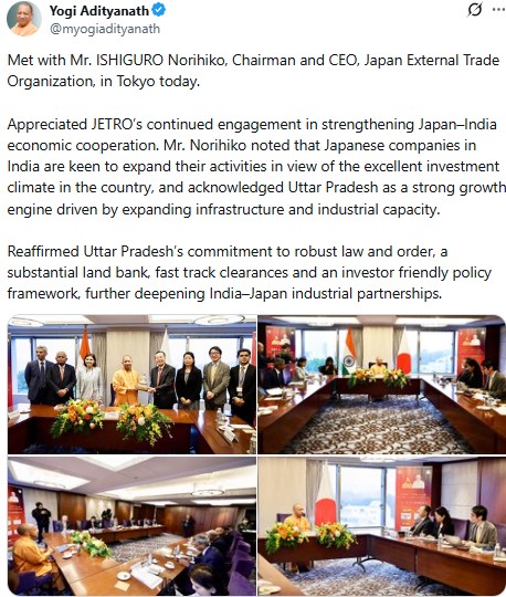Yogi Adityanath in a post on X wrote, "Met with Mr ISHIGURO Norihiko, Chairman and CEO, Japan External Trade Organisation, in Tokyo today. Appreciated JETRO's continued engagement in strengthening Japan-India economic cooperation. Mr Norihiko noted that Japanese companies in India are keen to expand their activities in view of the excellent investment climate in the country, and acknowledged Uttar Pradesh as a strong growth engine driven by expanding infrastructure and industrial capacity. Reaffirmed Uttar Pradesh's commitment to robust law and order, a substantial land bank, fast track clearances and an investor-friendly policy framework, further deepening India-Japan industrial partnerships."