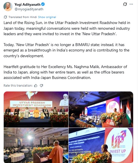 In another post on X, Yogi wrote, "Land of the Rising Sun, in the Uttar Pradesh Investment Roadshow held in Japan today, meaningful conversations were held with renowned industry leaders, and they were invited to invest in the 'New Uttar Pradesh'. Today, 'New Uttar Pradesh' is no longer a BIMARU state; instead, it has emerged as a breakthrough in India's economy and is contributing to the country's development. Heartfelt gratitude to Her Excellency Ms Naghma Malik, Ambassador of India to Japan, along with her entire team, as well as the office bearers associated with India-Japan Business Coordination."