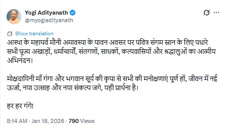 "On the sacred occasion of the great festival of faith, Mauni Amavasya, a heartfelt welcome to all the revered Akharas, Dharmacharyas, saints, sadhaks, kalpavasis, and devotees who have graced the holy Sangam for the sacred bath," he wrote in the post.