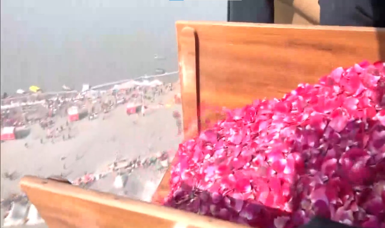 UP: Flower petals showered on devotees at Sangam on Mauni Amavasya