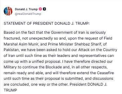 "I have therefore directed our Military to continue the Blockade and, in all other respects, remain ready and able, and will therefore extend the Ceasefire until such time as their proposal is submitted, and discussions are concluded, one way or the other. President DONALD J. TRUMP," the post read.